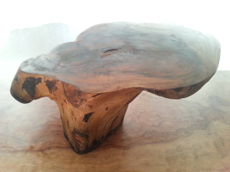 Tjsa, er ligt circa een jaar een boomstam bij onze voordeur, in dikke plakken gezaagd, zo’n 3 cm dik. Met van die dunne houtjes ertussen voor het drogen, onder de luifel …. Ja, ik zie u denken… Het is notenhout, mooi hout, grijzig hout. Wat gaan we toch doen met al dat hout? Kan ik wat doen met een stuk hout? En op een dag was het idee er gewoon. Ik ga een stuk hout in vilt verwerken. Het resultaat “hout heeft het koud…”.